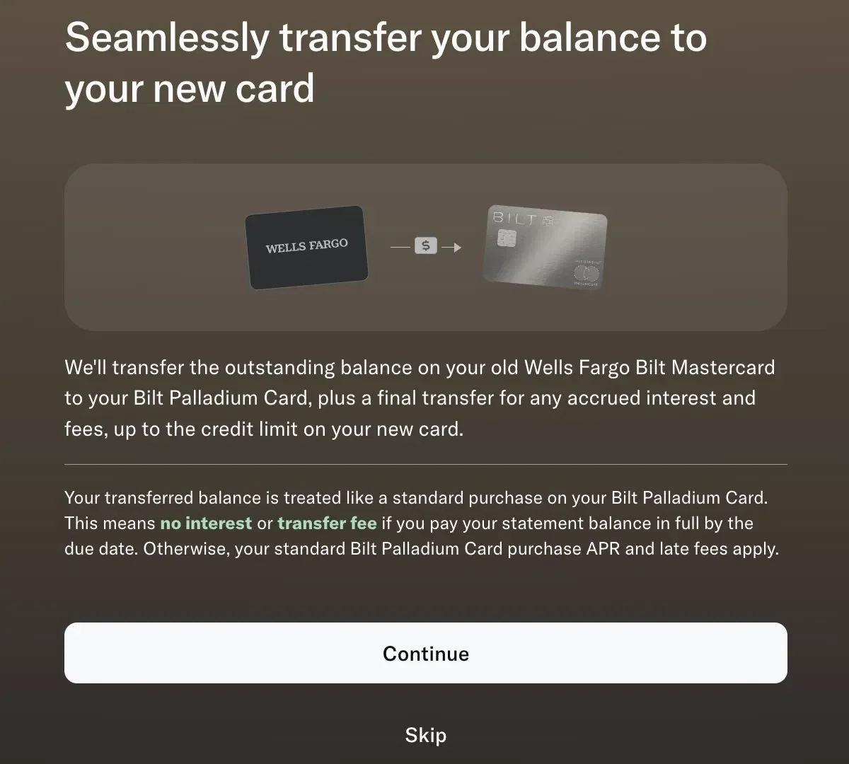 Lastly, you will be asked if you want to transfer your existing balance to your new Bilt card. There is no fee or added interest to do this, the balance on your current card will appear on your new Bilt card after February 7 as standard purchase for the amount owed.